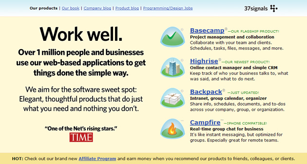 In the example above, the web applications that 37signals offers are shown here using a consistent visual motif. Most conspicuous is the distinct shape and color palette used for the icons, so we immediately perceive that the four bits of information about their web apps are related in some way. If we then read one of the examples, say the top one for Basecamp, we can then immediately assume (correctly) that all of the other entries that are styled and configured in this manner are also web apps offered by 37signals. Here, consistency of styling and presentation indicates consistency of category or context.