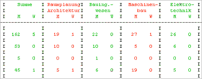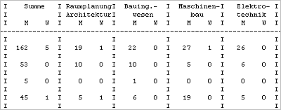 Dieses Layout ist alles andere als gelungen. Die Abstände der Werte innerhalb einer Kategorie - z.B. zwischen den Zahlen 162 und 5 (unter "Summe"), die logisch zusammengehören - sind größer als die Abstände zwischen den Werten und den Zeichen, welche die Spalten begrenzen (dem "I"). Unser Auge gruppiert unwillkürlich die falschen Zeichen zusammen - weshalb es ziemlich anstrengend ist, die Zahlen in der Tabelle zu analysieren.