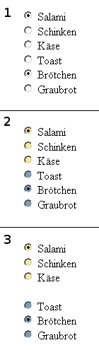 Nun mache ich mir in Variante 2 das Gesetz der Ähnlichkeit zu Nutze. Die Radiobuttons zur Brotauswahl haben in dieser Fassung eine andere Farbe als die Buttons zur Belagwahl. So kann der Nutzer sofort erkennen, dass es sich um unterschiedliche Auswahlgruppen handelt und dadurch den Konflikt der doppelten Auswahlmöglichkeit schnell auflösen.