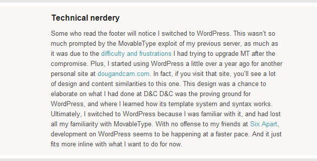 In the example above, Douglas Bowman has styled the links in the copy of his Stopdesign site to be blue, contrasting with the overall gray of his body copy. By the principle of similarity, those of us who can distinguish blue from gray automatically recognize that all text styled in this manner is link text.