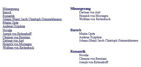 Die rechte, neu gestaltete Liste ermöglicht nun den Studierenden Zusammenhängendes auch zusammen zu sehen: Nach dem Gesetz der Nähe wurde thematisch Verwandtes nah beieinander gruppiert. Die nach dem Gesetz der Ähnlichkeit angelegte Struktur unterstützt die unmittelbare visuelle Orientierung innerhalb der Gruppe. Alle Überschriften erscheien optisch gleich, für die Unterpunkte gilt dies ebenso. Die beiden Strukturelemente unterscheiden sich in Schriftart und -größe sowie der Einrückung.
