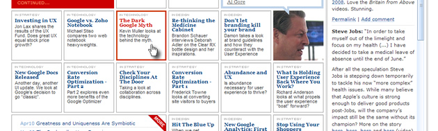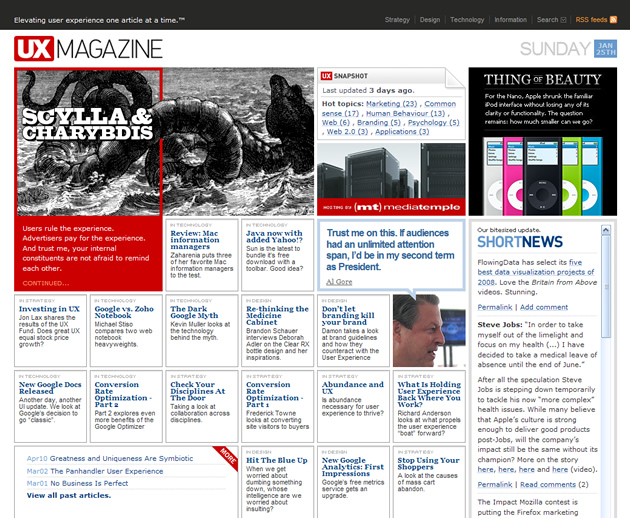 In the example above, the main page for (the now defunct??) UX Magazine uses the principle of similarity to communicate that all of the bits of content that appear inside square, gray-bordered boxes are references (links) to articles. This impression is then reinforced by the user experience: all of these elements have a consistent behavior when a cursor hovers over them (image below).