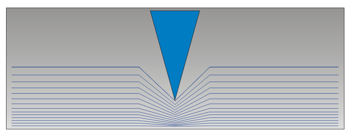 Bei der verbalen Beschreibung der Abbildung lieferten die Testpersonen keine rein geometrische Beschreibung der Zeichnung, sondern verwendeten bildhafte Vergleiche wie "eine Axt haut in eine Kerbe" (da die Linien an die Ringe eines Baumes erinnern), oder "ein Keil drückt in ein Kraftfeld", die auf eine Interpretation des Gesehenen schließen lassen. Der Wahrnehmungsakt wird dadurch erleichtert, dass die Elemente nicht beziehungslos nebeneinander stehen, sondern in einen natürlichen Zusammenhang gebracht werden. Auch der Beschreibungsaufwand selbst verringert sich, da es grundsätzlich schwieriger ist, unabhängige Reizmuster präzise zu bestimmen als bekannte oder konventionelle Formen. Das Beispiel stammt aus einer Testreihe, die Manfred Massironi zusammen mit Paolo Bonaiuto [Mas02:207] im Jahre 1965 durchführte: Die gezeigten Bilder führten beim Betrachter zu einer spontanen kausalen Interpretation.