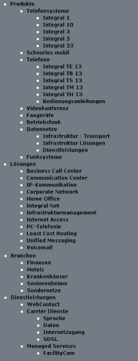 Diese Sitemap stammt von der Website der der Fa. "Tenovis". Die rechteckigen Bullets sind so angeordnet, dass die Seiten der 1. 2. und 3. Ebene in der Senkrechten auf einer (gedachten) Linie liegen. Die unsichtbare Linie, welche die Seiten einer Ebene miteinander verbindet, wird natürlich besonders prägnant, wenn die Links direkt direkt untereinander liegen.