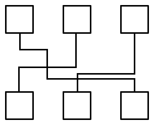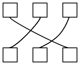 Links sehen wir nun ein ganz einfaches Diagramm, das Verbindungen von jeweils einem oberen Kästchen zu einem der unteren Kästchen aufzeigt.