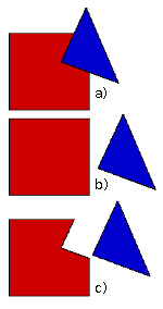 Das Gesetz der Kontinuität bezieht sich aber nicht nur auf die Fortsetzung von einfachen Linien, sondern ebenfalls auf komplexere Elemente. In der nebenstehenden Grafik sehen wir unter a) eine rote Form und ein blaues Dreieck. Da das Dreieck die blaue Form überschneidet und somit teilweise verdeckt, können wir eigentlich keine Aussage über die tatsächliche Form des roten Bereichs machen.