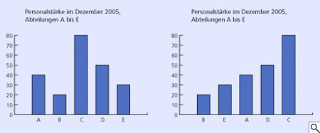 So kann man z. B. bei den beiden Balkendiagrammen, wenn man mal annimmt, dass auf beiden die Anzahl der Mitglieder der Fußballvereine A bis E dargestellt werden, im ersten Bild oben besser die Reihenfolge A bis E vergleichen und im zweiten besser die Anzahl der Mitglieder der Vereine erkennen.